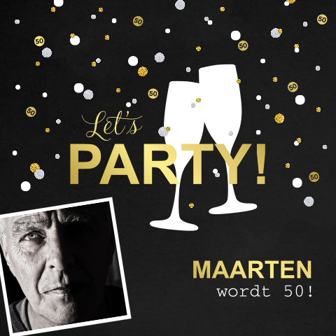 Hippe uitnodiging 50e verjaardag met goudfolie confetti en foto